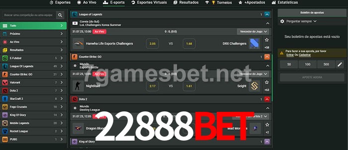 O 22888Bet oferece uma grande seleção de opções de apostas em e-sports com probabilidades competitivas